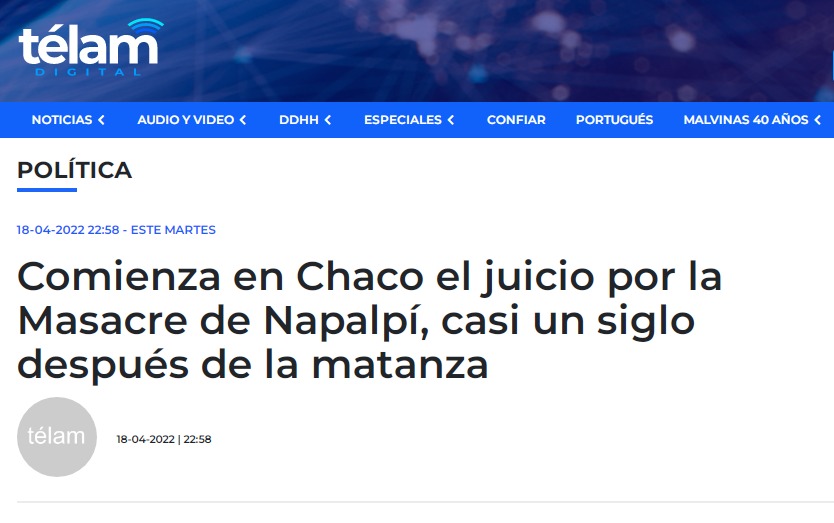 Llegan así a esta farsa de juicio oral por la verdad a la Masacre de Napalpí, como se conoce el fusilamiento de más de 400 integrantes de etnias Qom y Moqoit por parte de fuerzas estatales y colonos del entonces territorio nacional de Chaco el 19 de julio de 1924.